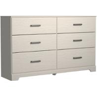 with its clean-lined look and modern attitude, this dresser is a fresh style awakening. crisp, white hue over subtle replicated wood grain easily complements other furniture finishes. smooth drawer fronts with antiqued pewter-tone handles completes the aesthetic..